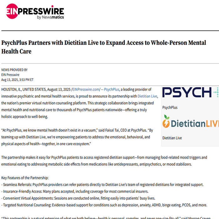 • PsychPlus Partners with Dietitian Live to Expand Access to Whole-Person Mental Health Care